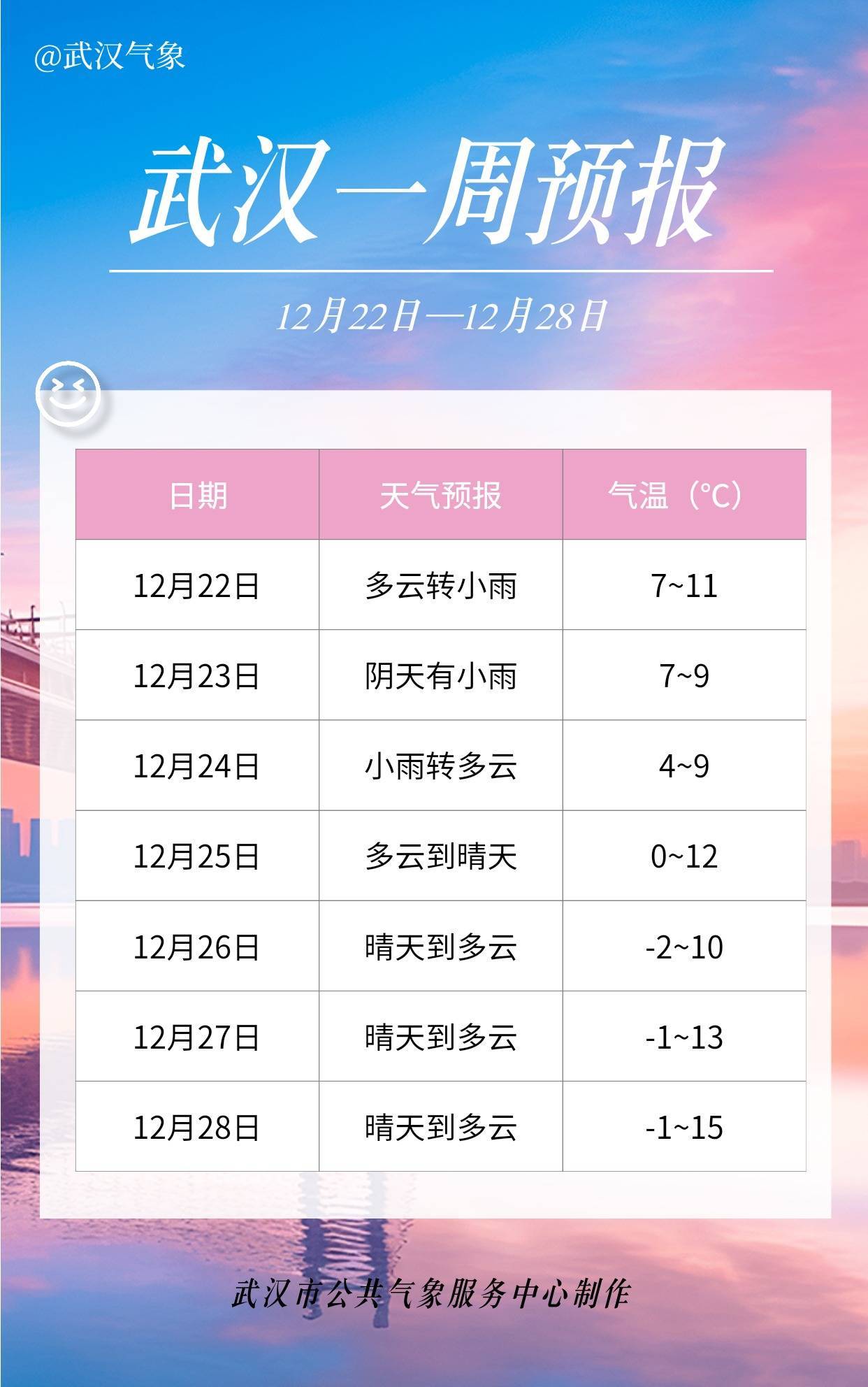 今天武汉市北风暂歇,但阳光并未正式上线,气温仅有5~11℃,体感仍有些寒冷。预计未来一周武汉市前雨后晴。23-25日受弱冷空气影响,武汉市北风增强、气温下降,最高气温将不足10℃,其中22-24日武汉市有弱降水,外出建议带好雨具或者帽子,做好保暖工作,小心冬雨+北风的魔法湿冷攻击。