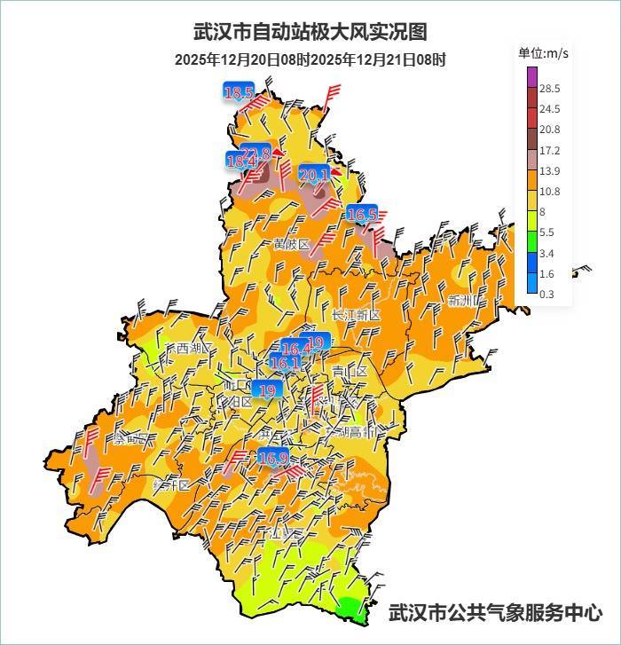 昨天武汉市白天阴天、有短时小雨,有中到重度霾,夜间普降小雨、局地中雨,受冷空气影响,大部地区出现6到8级偏北阵风,最大阵风为黄陂矿山站22.8m/s(9级,20日20:27)。